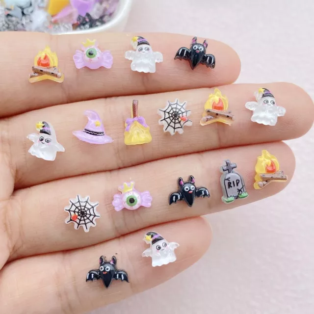 100Pcs Halloween Nail Art Charms – Cute 3D Bat & Ghost Resin Decorations